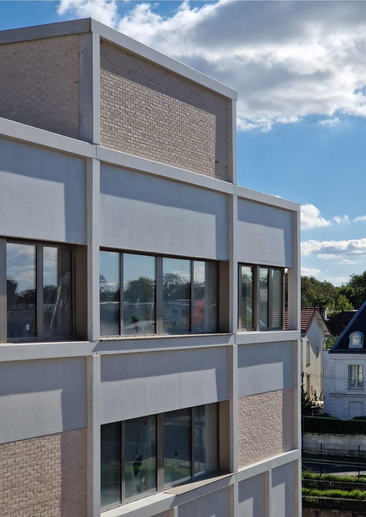 La structure du bâtiment conçue en béton pré-fabriqué est visible en façade et constitue des modénatures, qui créent des jeux d’ombres et de lumières, assurant à la fois l’esthétique et la pérennité de l’ouvrage en le protégeant des ruissellements d’eau.