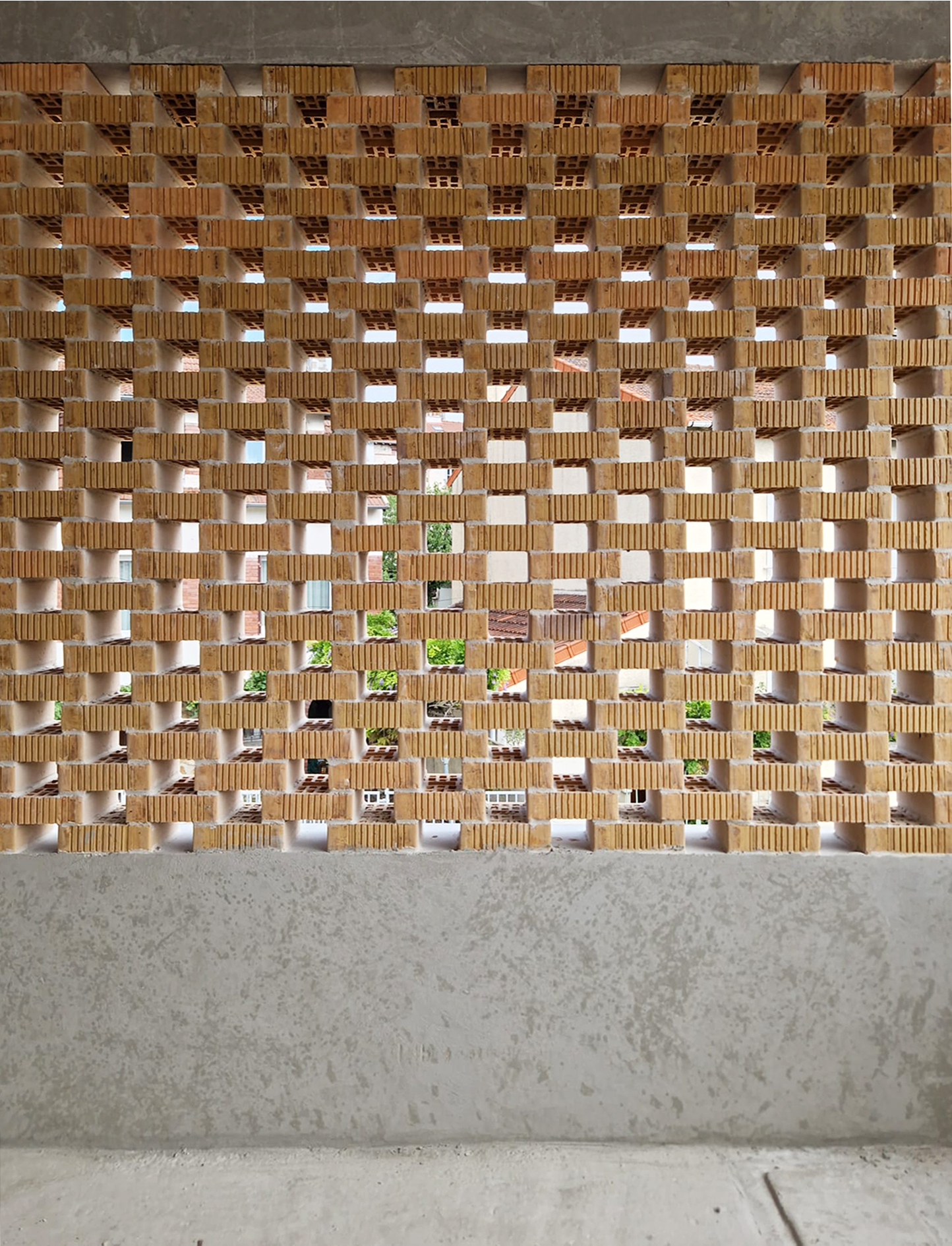 Au niveau R+1, la brique est traitée avec un dispositif de moucharabieh, créant une façade ajourée qui permet la ventilation du parking. Le niveau R+2, largement vitré et transparent, est complété par un système de jardinières en façade qui limitent les vis-à-vis avec le voisinage. Les menuiseries en aluminium anodisé bronze et les fenêtres équipées de brise-soleil orientables complètent cet agencement.