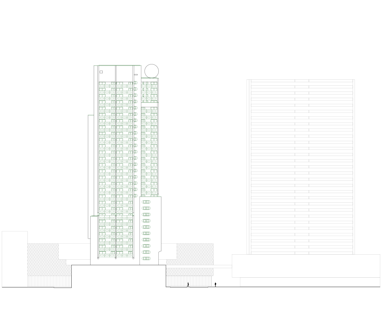 Son observation a permis de décomposer sa géométrie en plusieurs volumes simples aux teintes différenciées. De cette façon, la tour apparaît comme un ensemble d’immeubles encastrés les uns dans les autres autour d’un noyau central, permettant de retrouver des proportions plus élancées.