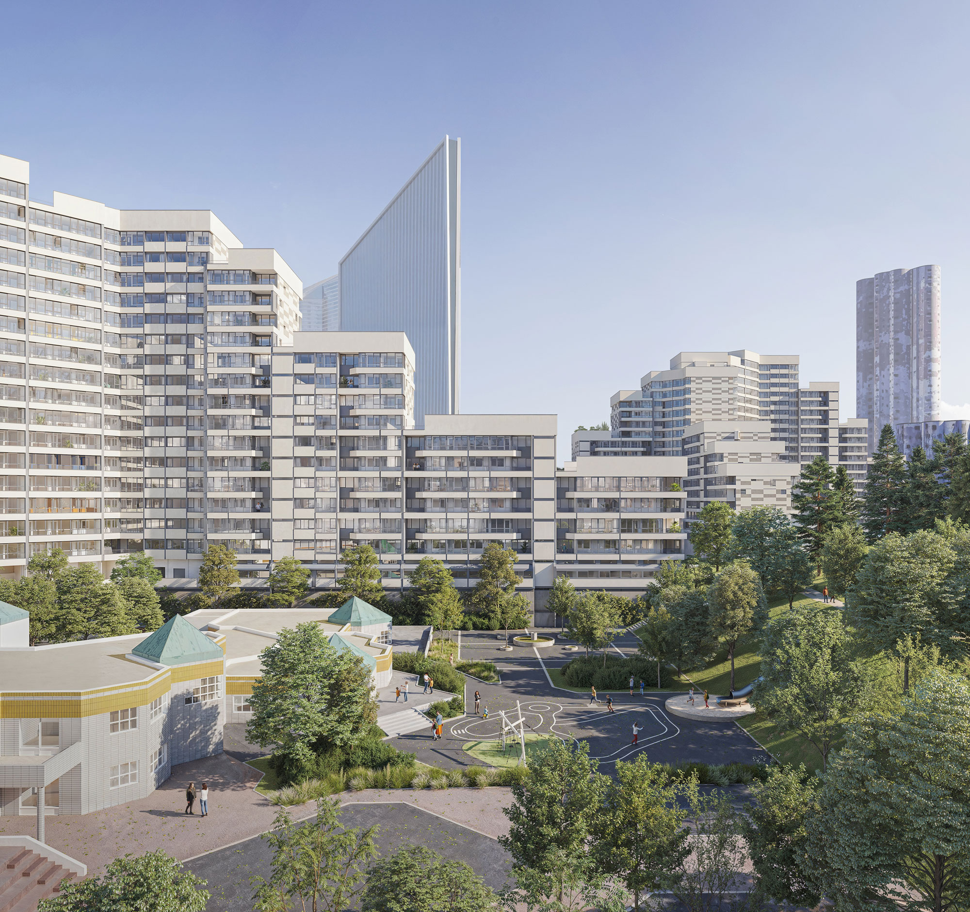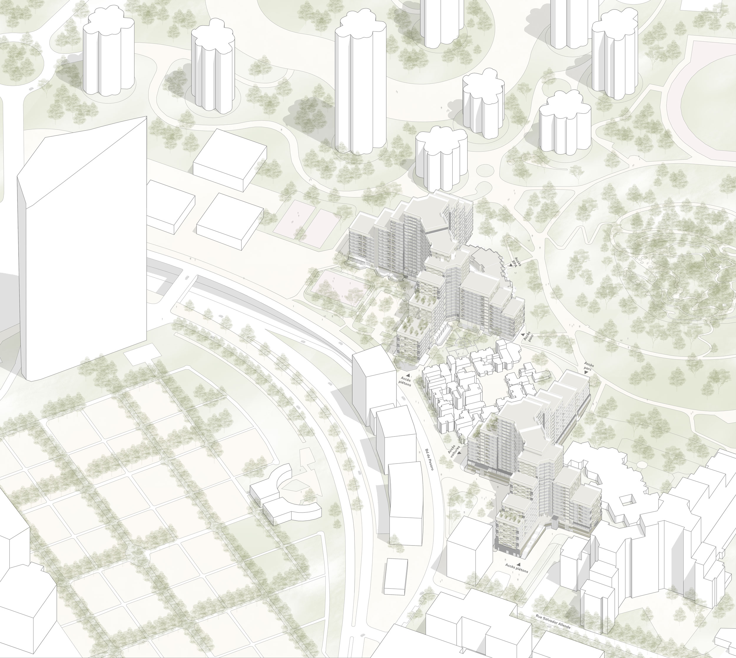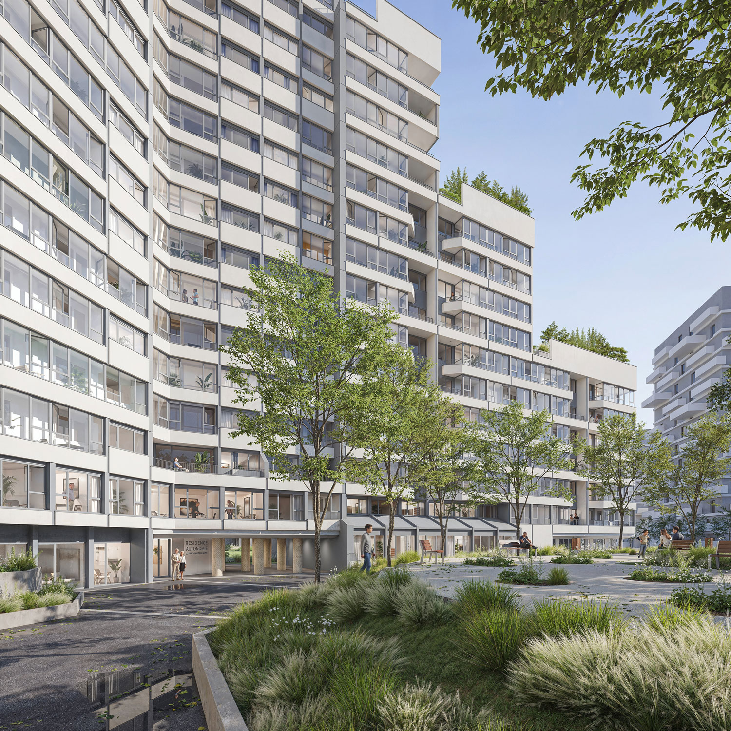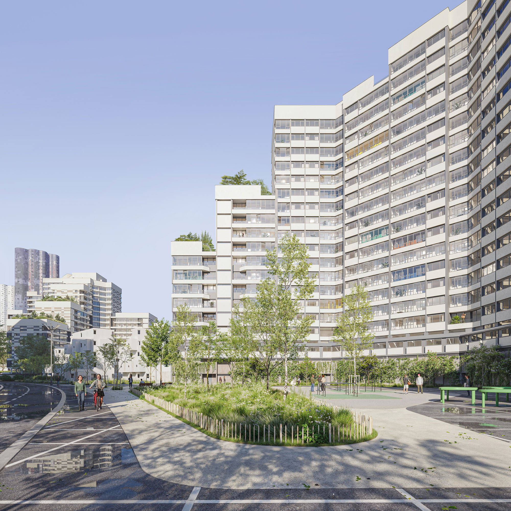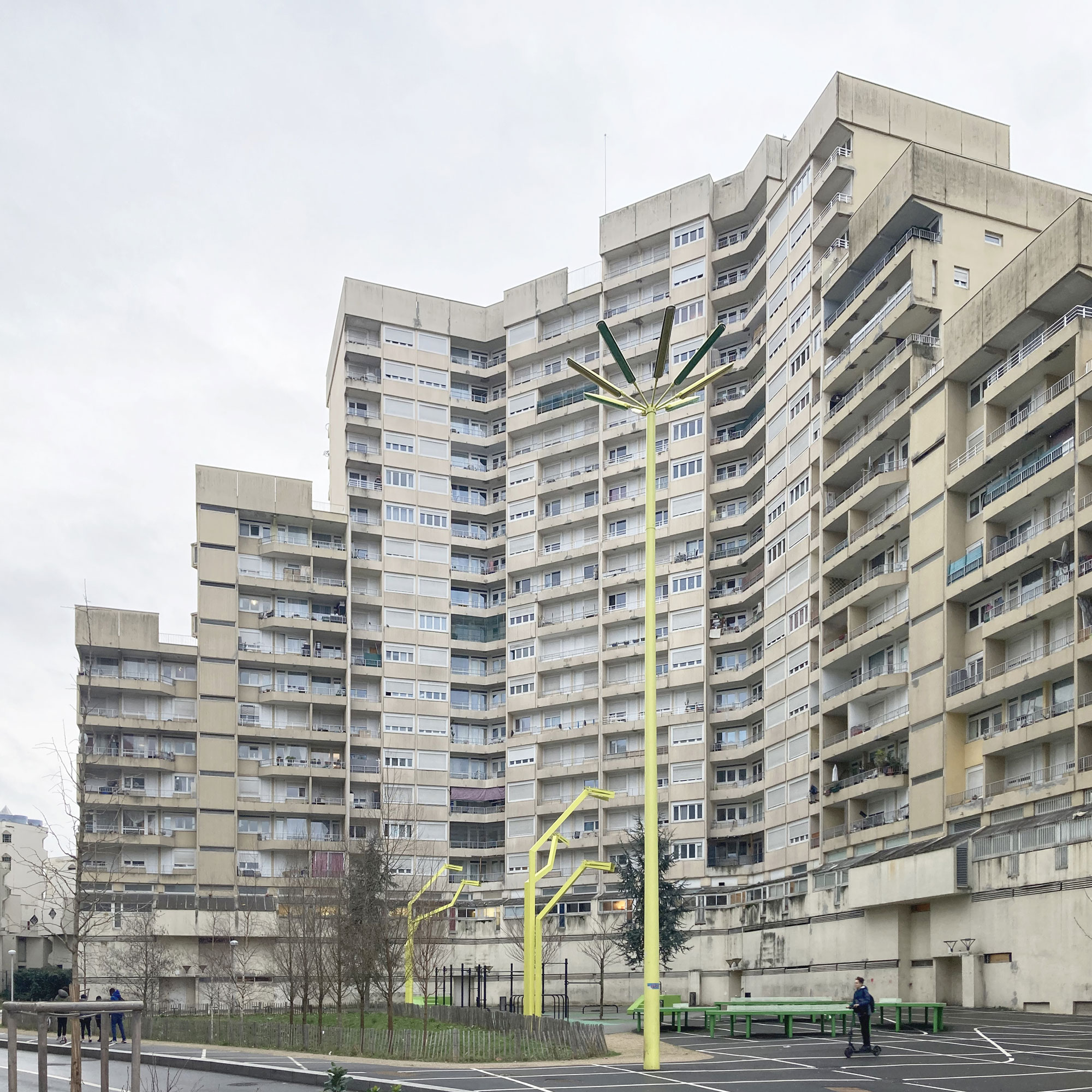Les résidences Egalité et Fraternité, ont été conçues par Jacques Kalisz dans les années 70, sous la forme d’immeubles de type cruciforme de grande complexité, faisant écho à l’architecture méga structuraliste de cette époque. Ces bâtiments sont donc à considérer comme un patrimoine atypique faisant parti d’un ensemble inachevé, riche en termes de dispositifs architecturaux et qui s’inscrit dans un travail plus important à l’échelle du quartier.