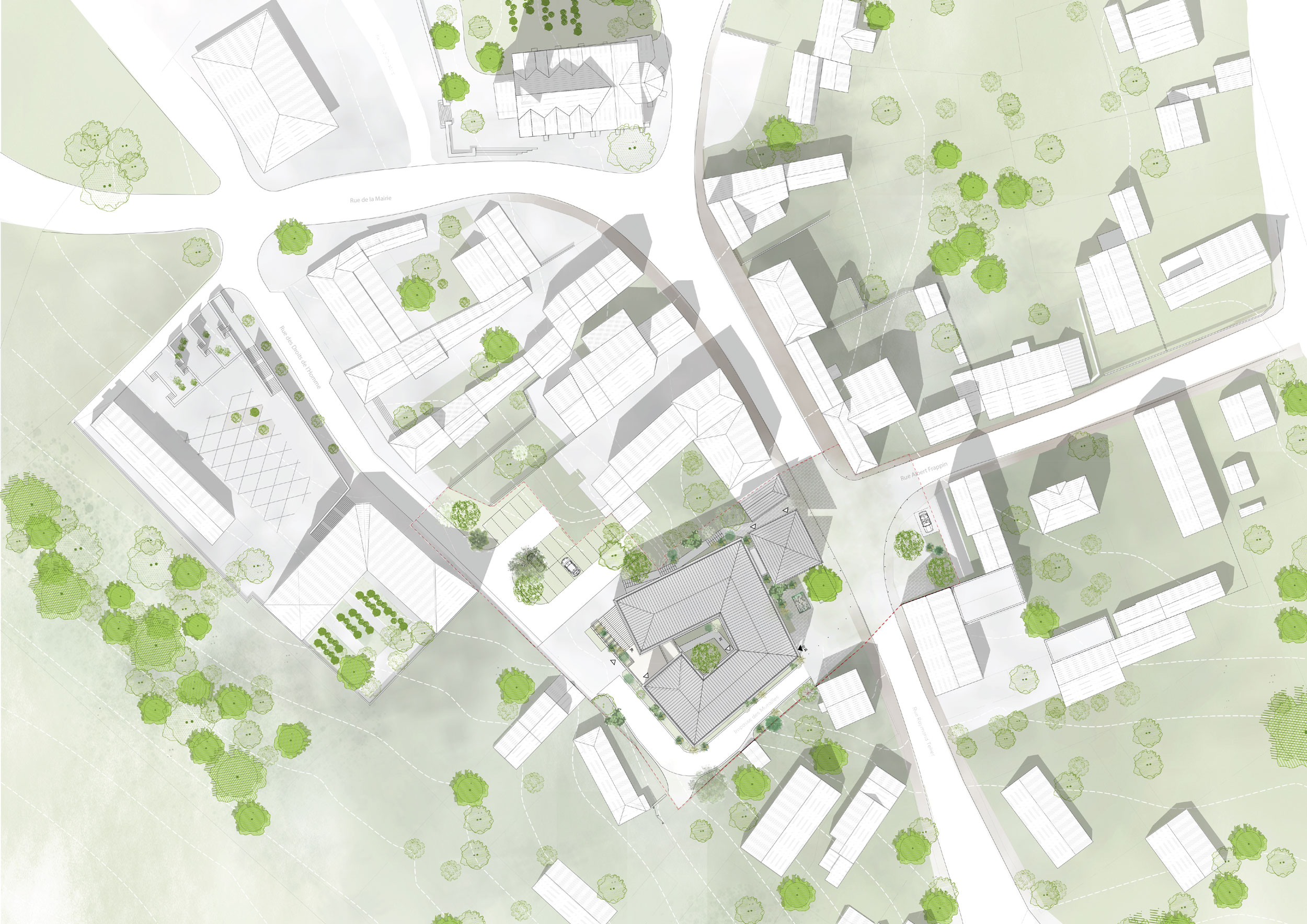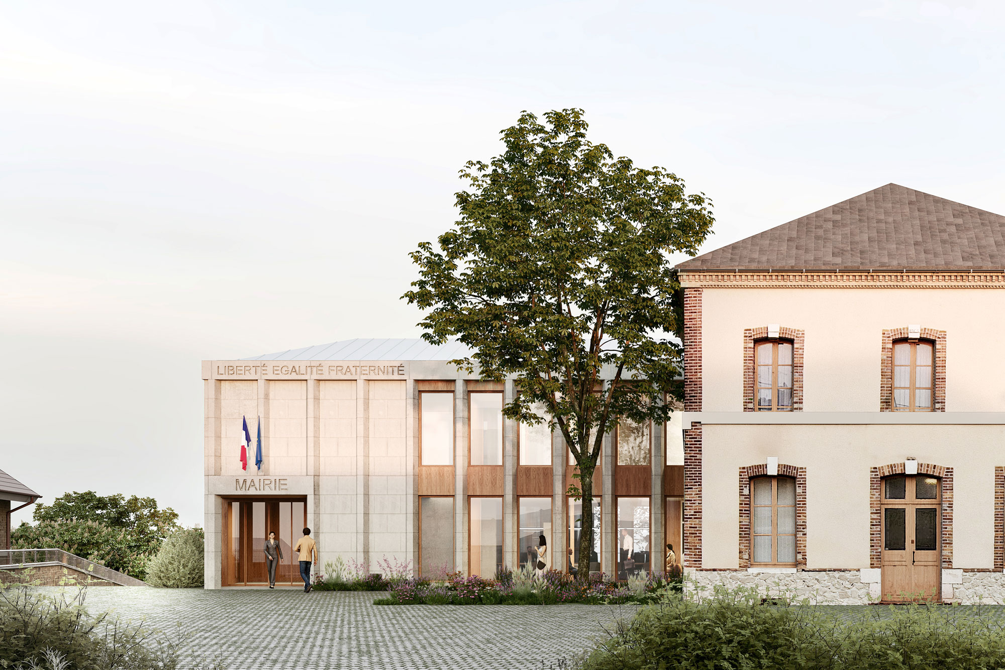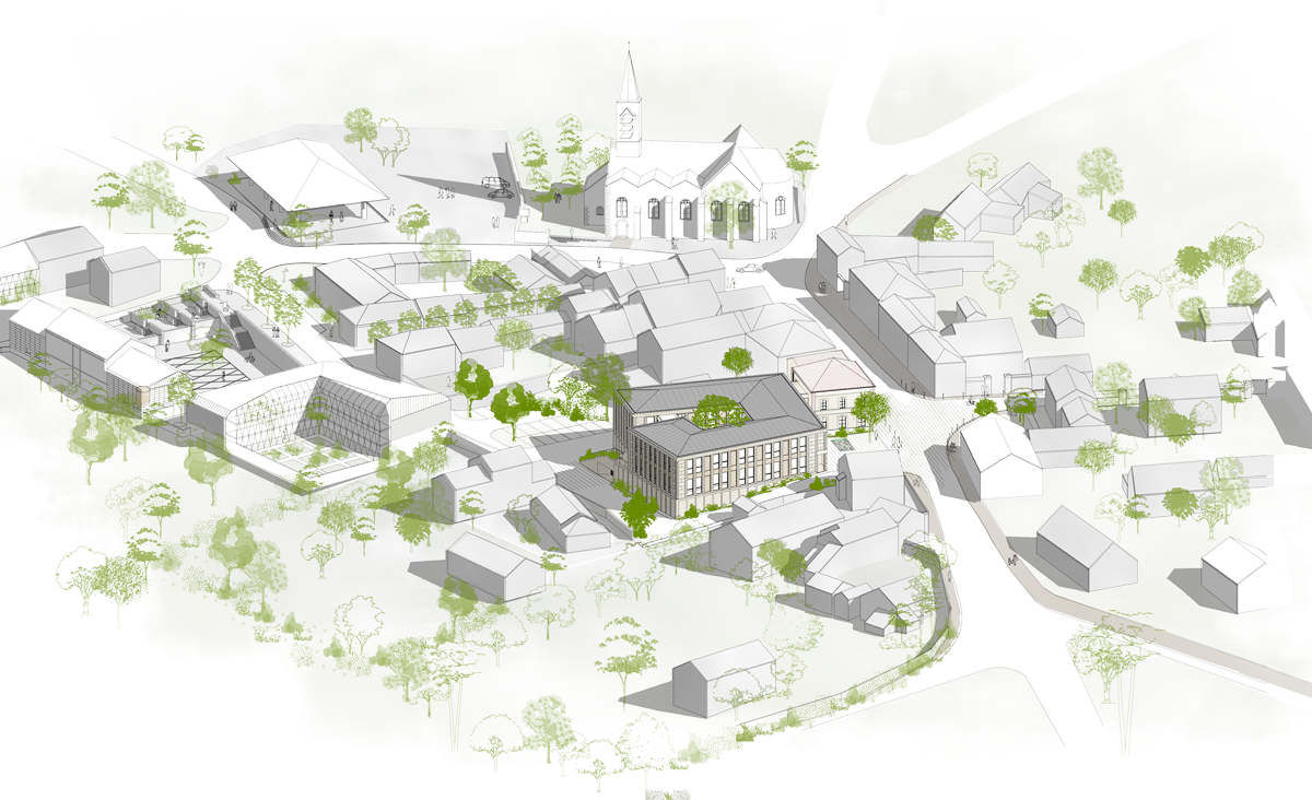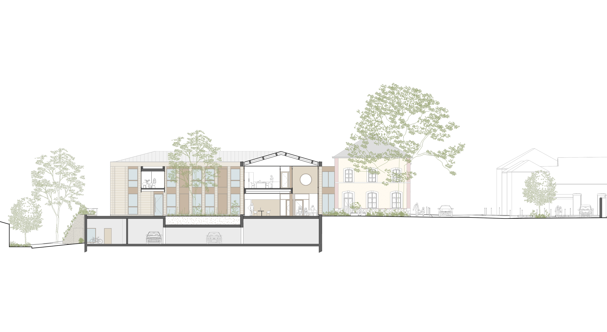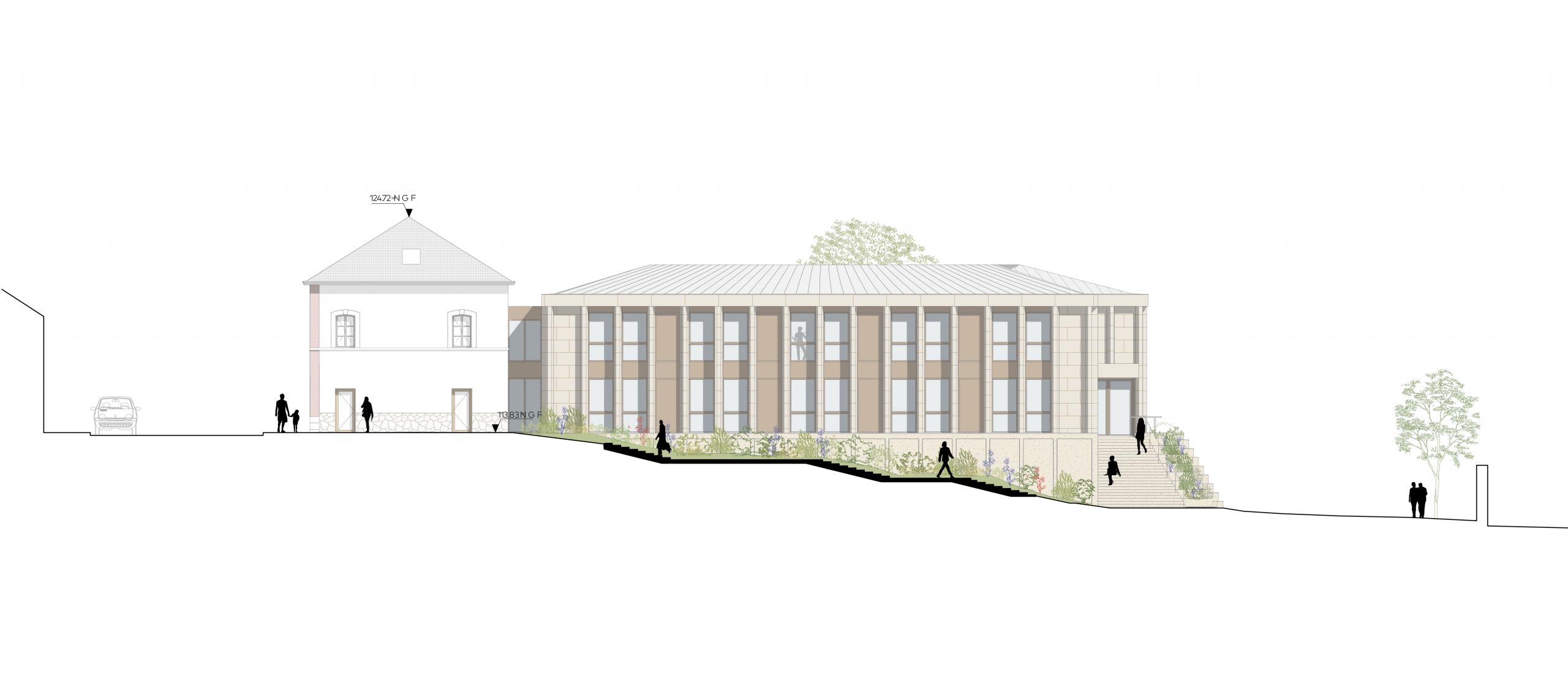 L’extension se développe à l’arrière de la façade principale, autour d’un patio central qui articule les différents éléments du programme. Ce patio arboré permet de créer une centralité particulière à l’équipement tout en offrant un espace végétal et intime au cœur du bâtiment.
