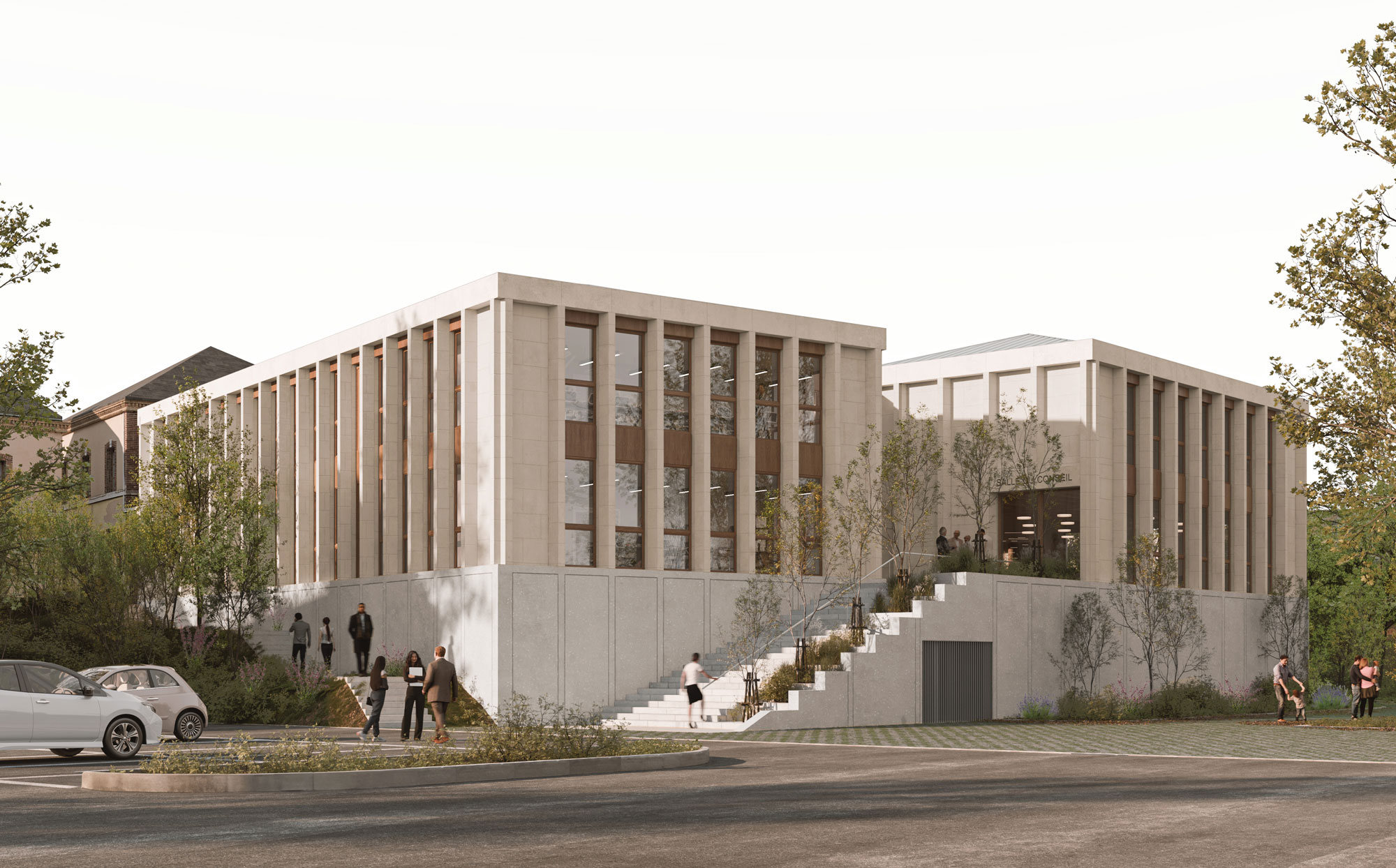 Cette situation en promontoire permet également de travailler un deuxième accès à la salle du conseil, qui s’ouvre sur une terrasse haute offrant une vue dégagée sur le panorama et des perspectives lointaines sur les coteaux du Gâtinais et la médiathèque. Cette terrasse, qui peut fonctionner comme extension de la salle du conseil en cas d’évènements particuliers, se transforme en un vaste emmarchement, sculptural et majestueux, qui descendant vers la rue des Droits de l’homme, connecte la mairie aux autres équipements, et en devient le prolongement.