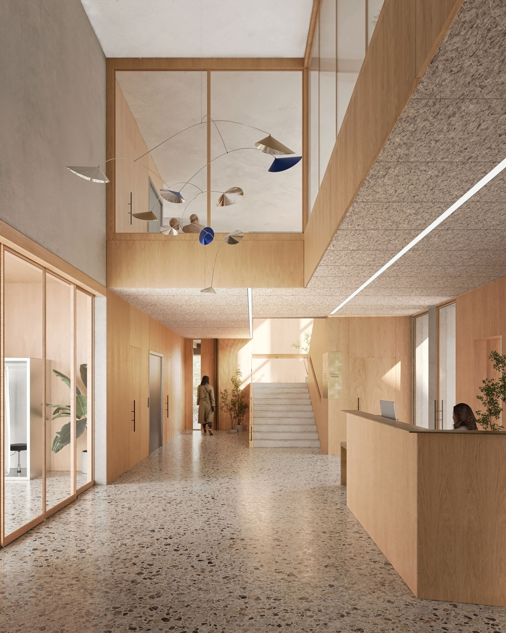 Le hall se trouve à la jonction entre le pôle public, la salle du conseil, et l’accès à l’étage. Rotule de l’établissement, il permet de desservir l’ensemble des services depuis un lieu unique, remplissant sa fonction première d’accueil et d’orientation des différents publics.