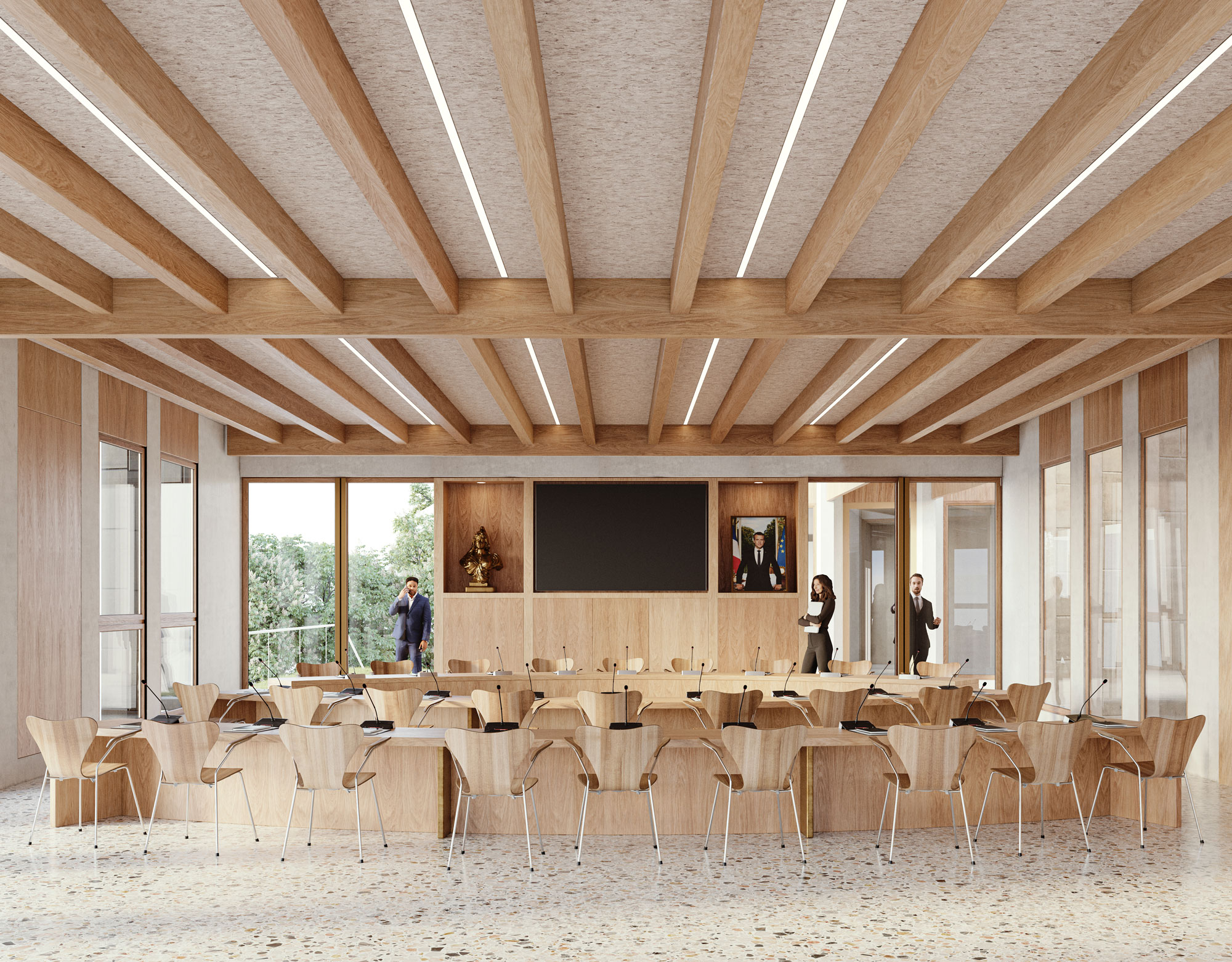 De l’autre côté du rez-de-chaussée, la salle du conseil se situe en proue de bâtiment profitant d’une position de surplomb par rapport à l’espace public, rendu possible par l’importante déclivité du site. Elle est accessible depuis l’intérieur dans la continuité directe du hall par une porte de grande dimension symbolisant son importance. De grands vitrages des quatre côtés de la salle multiplient les vues et offrent une belle luminosité, sa position en hauteur garantissant sa confidentialité.