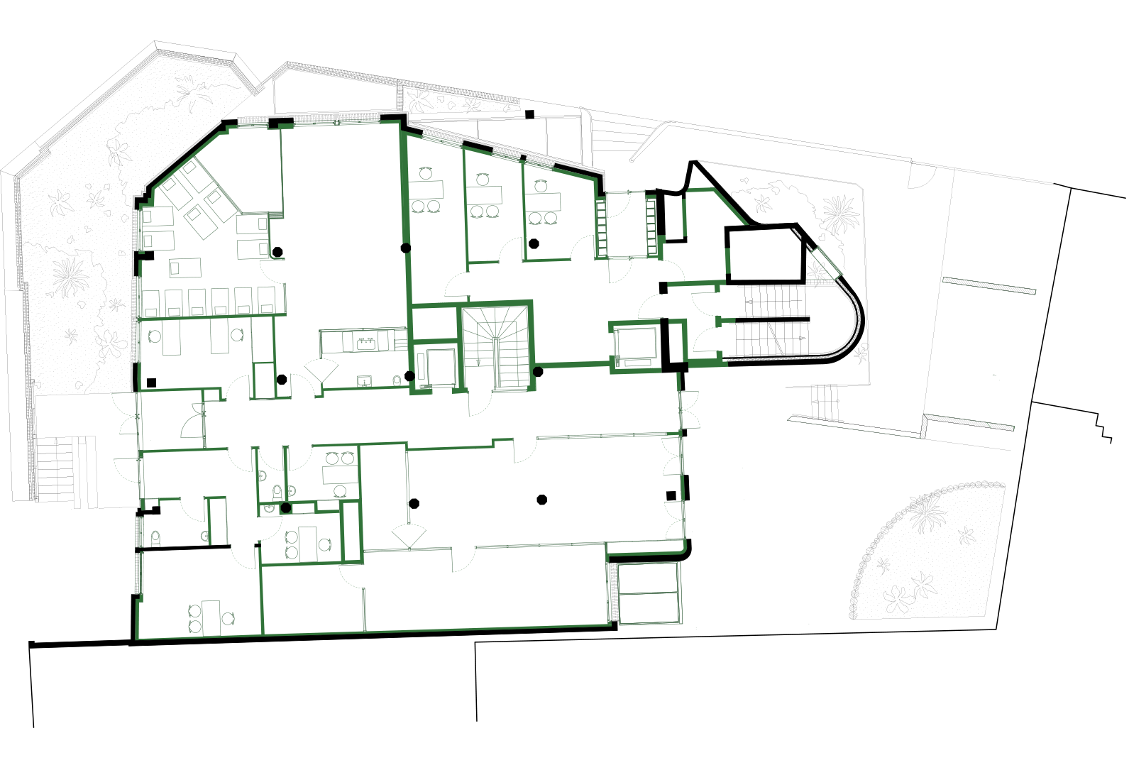 Les façades du bâtiment existant sont nettoyées et restaurées à l’identique.