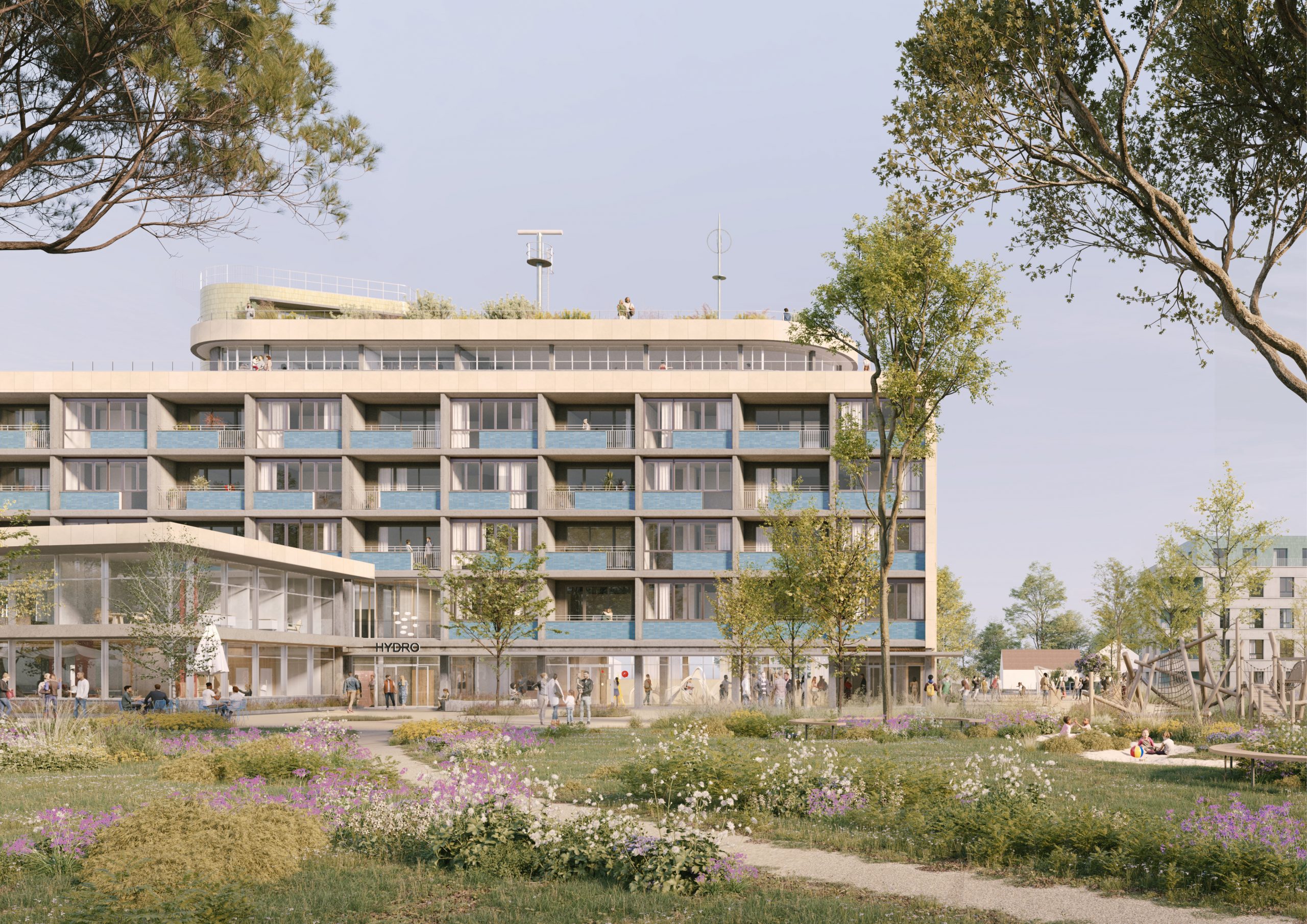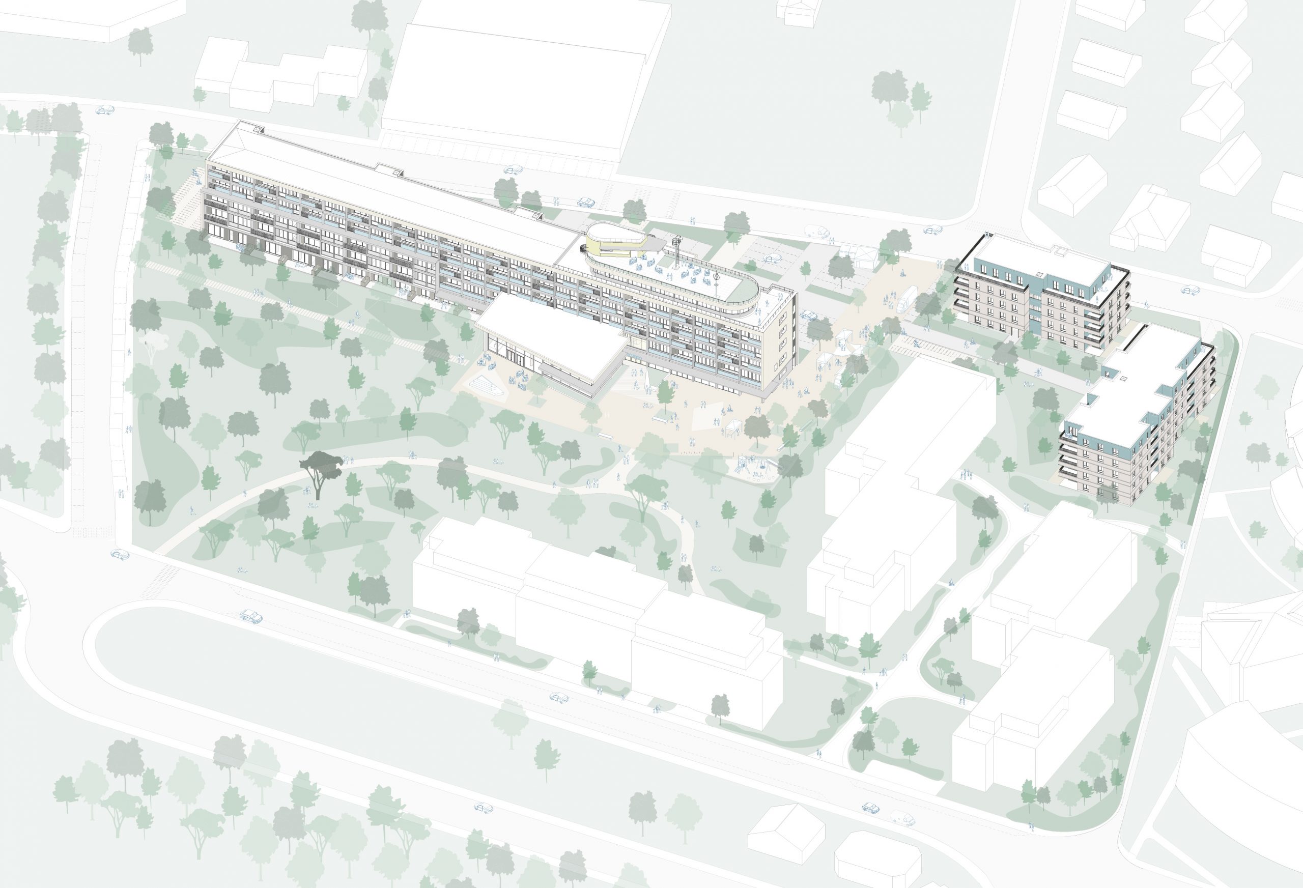 du site, agit comme un liant unificateur entre les bâtiments existants, les constructions neuves, les circulations,
