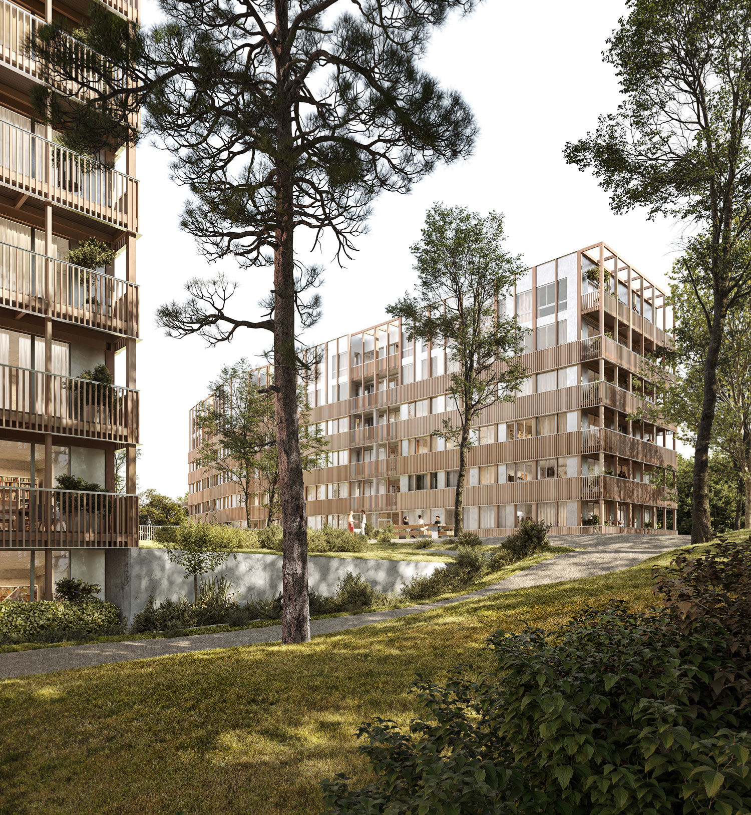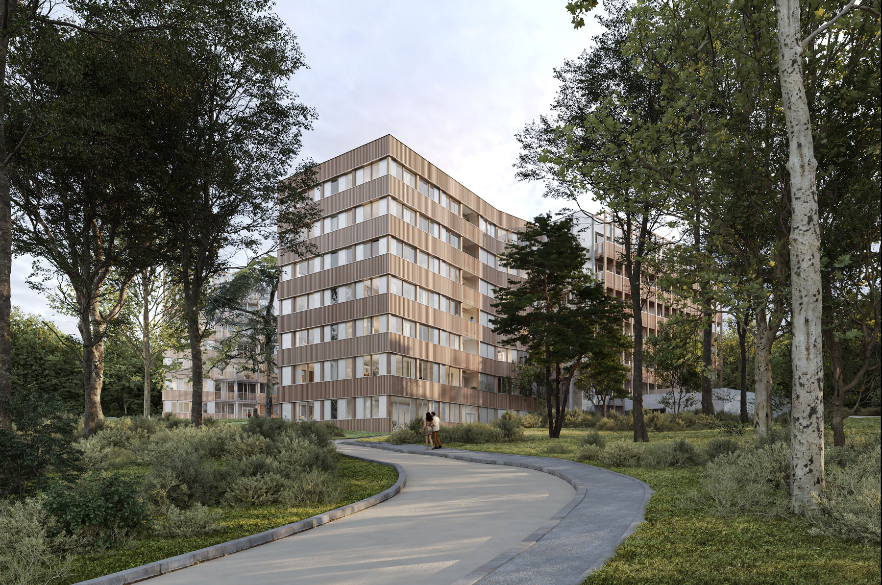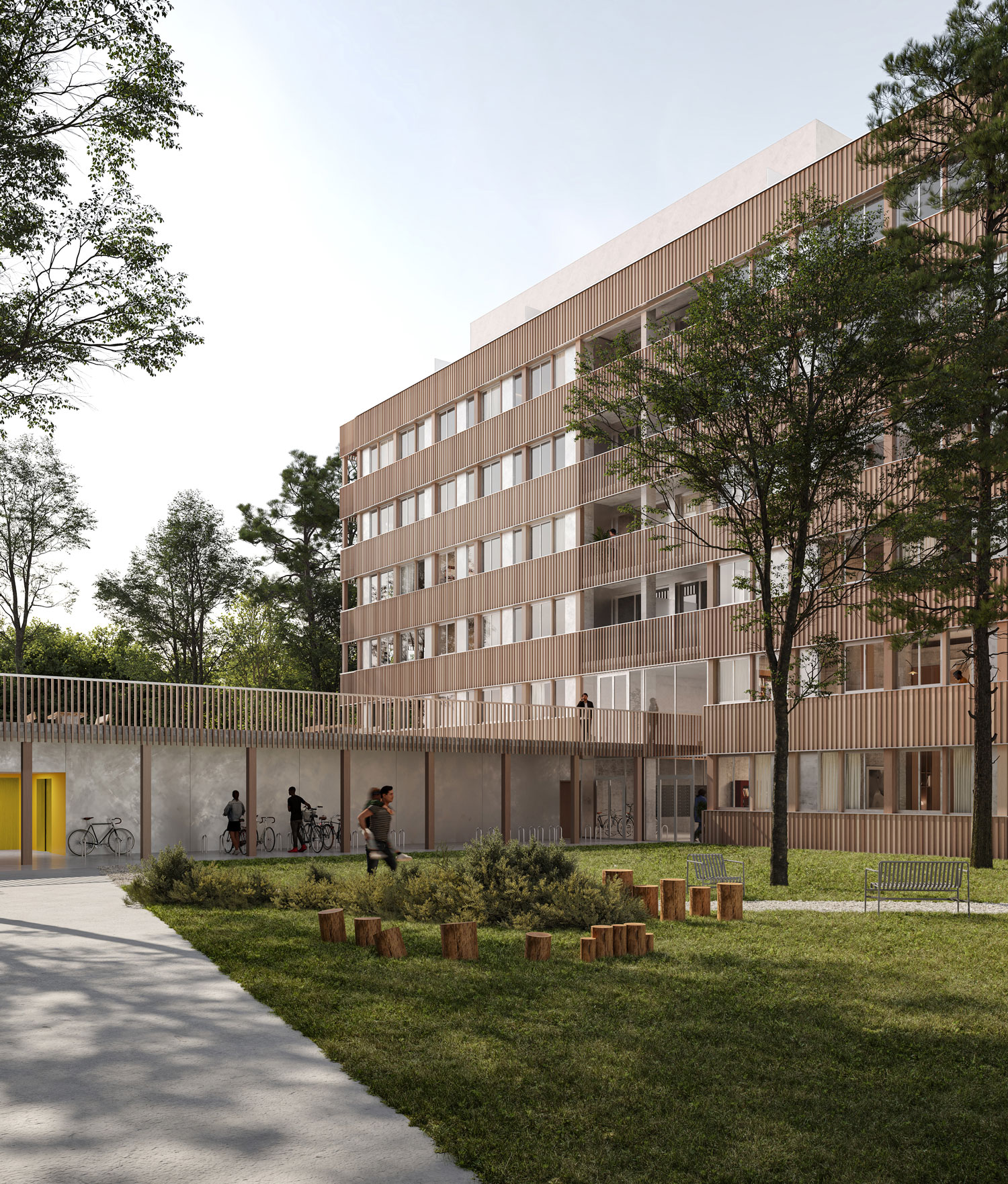 l’entrée des logements. Pour vivre pleinement l’expérience d’une résidence en cœur de parc, les habitants traversent ce jardin comme un seuil.