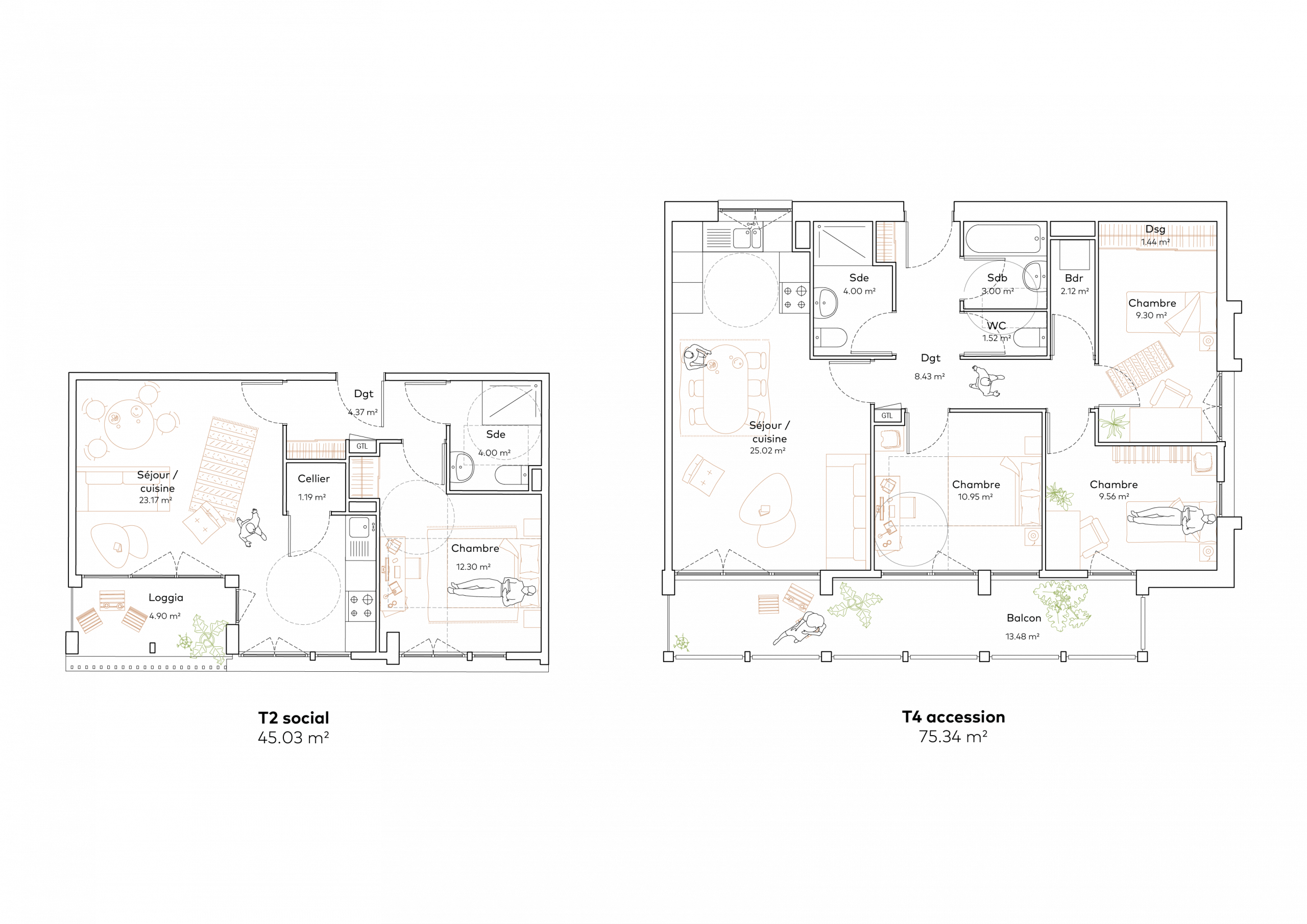 Ce principe de distribution et de courettes donne aux logements de multiples orientations et permet de rationaliser le plan d’étage courant. Dans ce même esprit, les différentes typologies sont dessinées au plus près de la trame structurelle existante et s’adaptent à l’existant tout en garantissant les standards de confort et d’accessibilité.