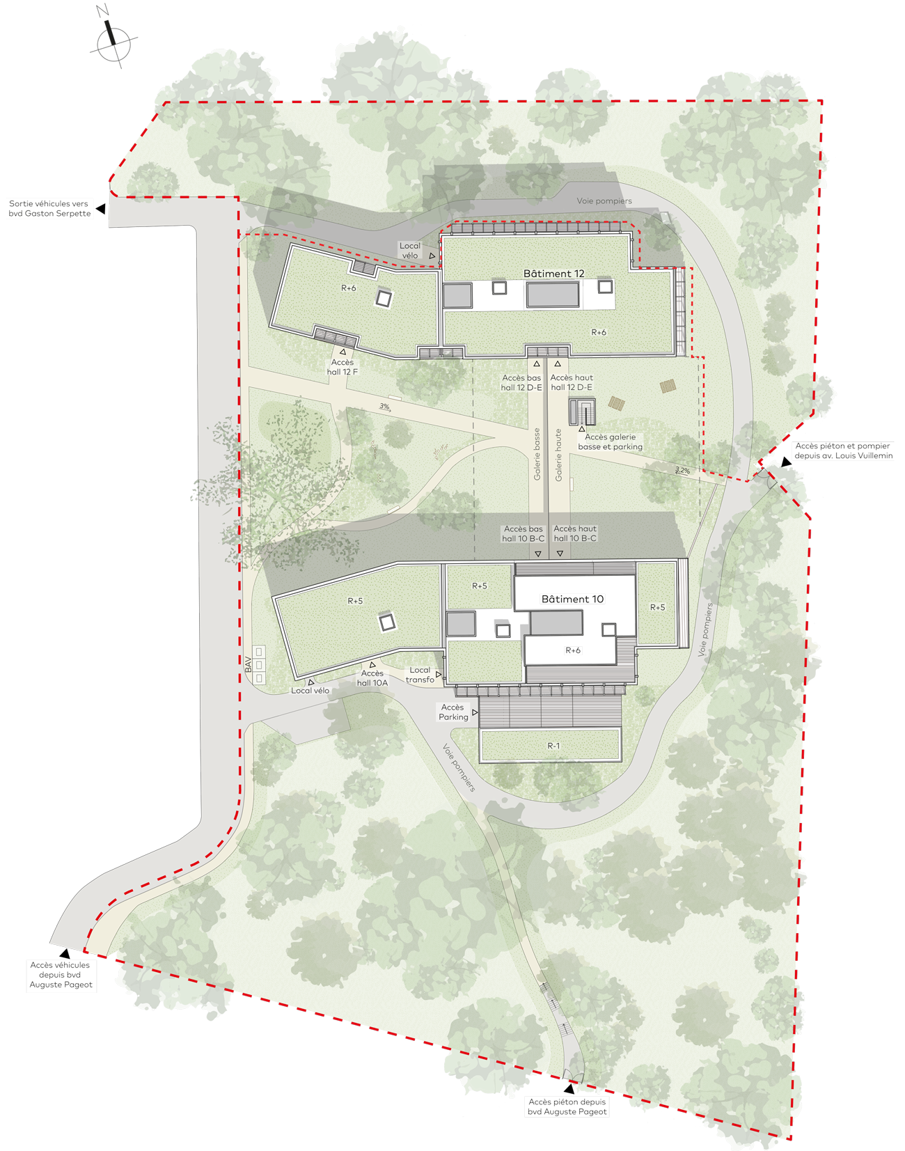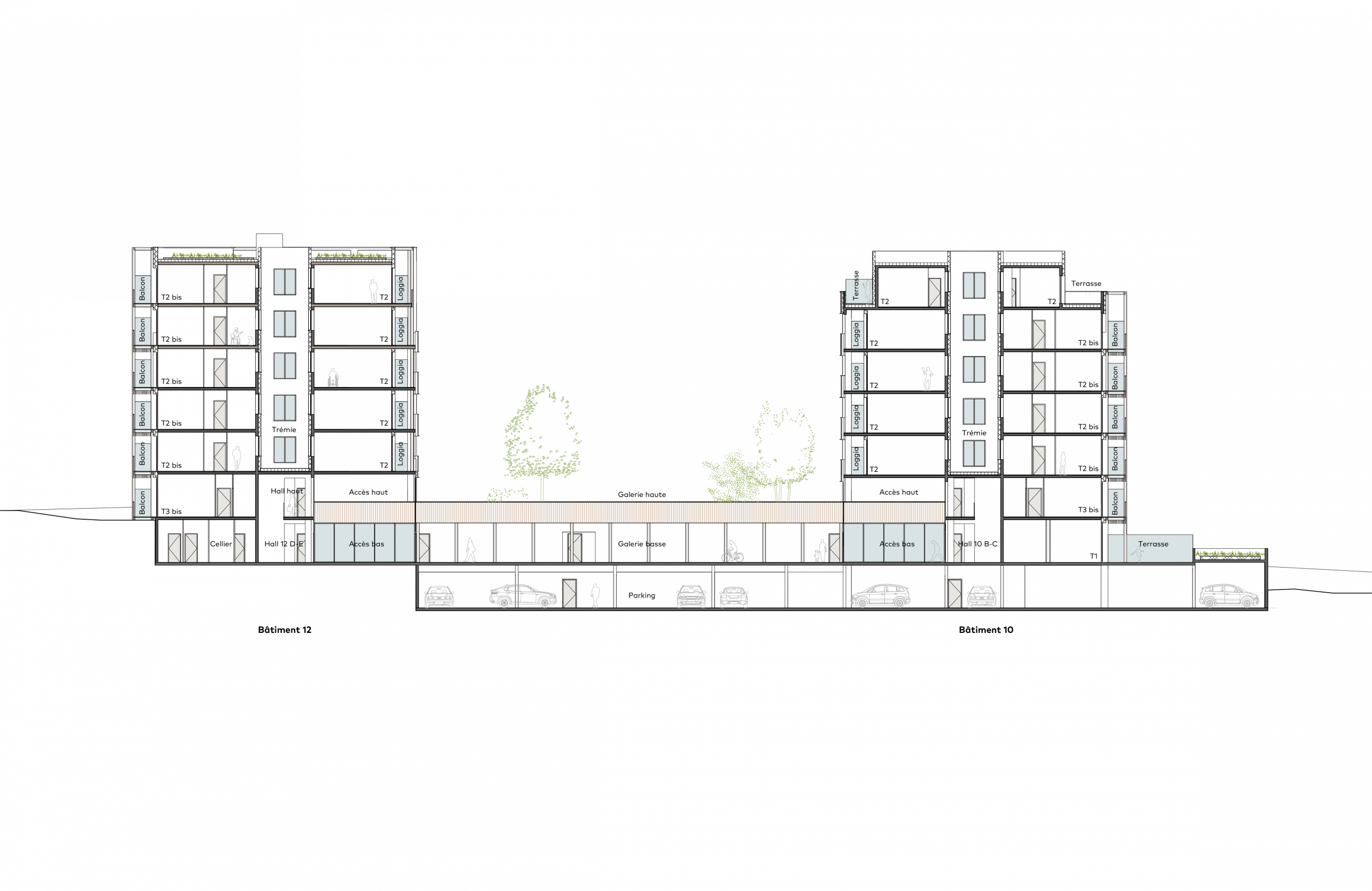 Une grande galerie sur deux niveaux, reliant le bas du site à l’avenue Vuillemin en partie haute, définit le jardin central. Dissimulant le parking et accueillant la majeure partie des locaux vélos, elle crée un effet de socle entre les deux bâtiments et offre un accès couvert aux habitants.