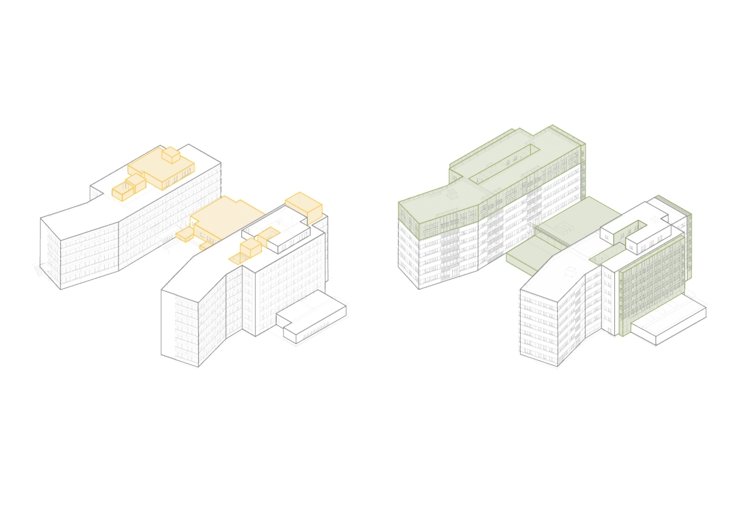 Le choix a été porté sur une surélévation sur un seul des deux bâtiments, afin de concentrer les efforts de reprise structurelle, mais également de rééquilibrer l’ensemble architectural. La surélévation est traité en façade avec le même registre architectural que les niveaux inférieurs existants, mais en supprimant l’allège pleine afin de refléter l’écriture contemporaine de cet ajout.